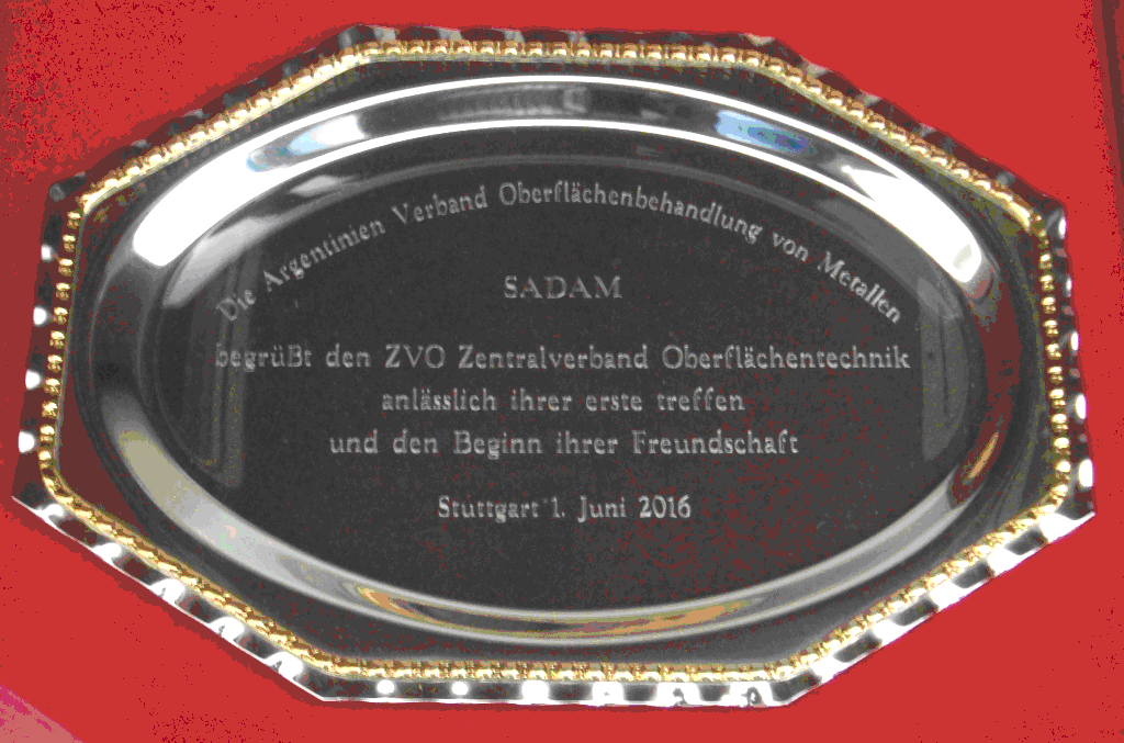 Ambas ferias concentraron 353 empresas que exhibieron sus productos y servicios, además de los stands institucionales, dentro de los cuales se destacaron los de las regiones de BadenWurtemberg, Bayern y Nord Rhein Westphalen, espacios que fueron compartidos por varias universidades y centros e investigación y capacitación, como el Fraunhofer Institut. En el centro de la muestra se ubicaba el stand de nuestra cámara colega, la ZVO (Zentralverband Oberflächentechnik, www.zvo.org), donde la delegación fue recibida por su Presidente Rainer Venz y su Director Ejecutivo, el Dr. Sâsa Jacob. Luego del saludo protocolar se abordaron temas de mutuo interés, planteándose posibles líneas de acción futura. El encuentro finalizó con la entrega de un recordatorio del primer encuentro institucional por parte del Presidente de SADAM, Ing. Fabio Pennella.